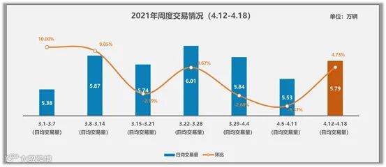 4月第二周日均交易量5.79万辆,较第一周环比增长4.73%,与3月第二周交易情况相比同比下降了1.30%。