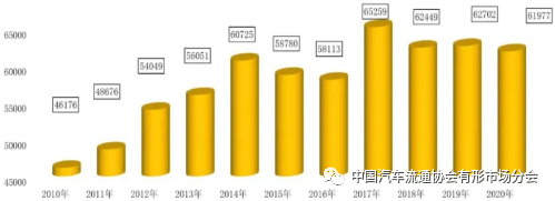 从百强交易市场发展状态反映出行业集中度在不断提升,年交易2万辆以下的市场在逐年减小,2019年,百强交易市场中已没有2万辆以下的市场,其中5~10万和10万台以上的市场在逐年增加。