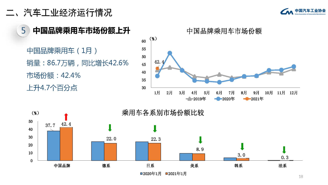自主品牌乘用车方面,1月自主品牌乘用车销量共销售86.7万辆,同比增长42.6%,要明显大于行业水平。占乘用车销售总量的42.4%,同比上升4.7个百分点。