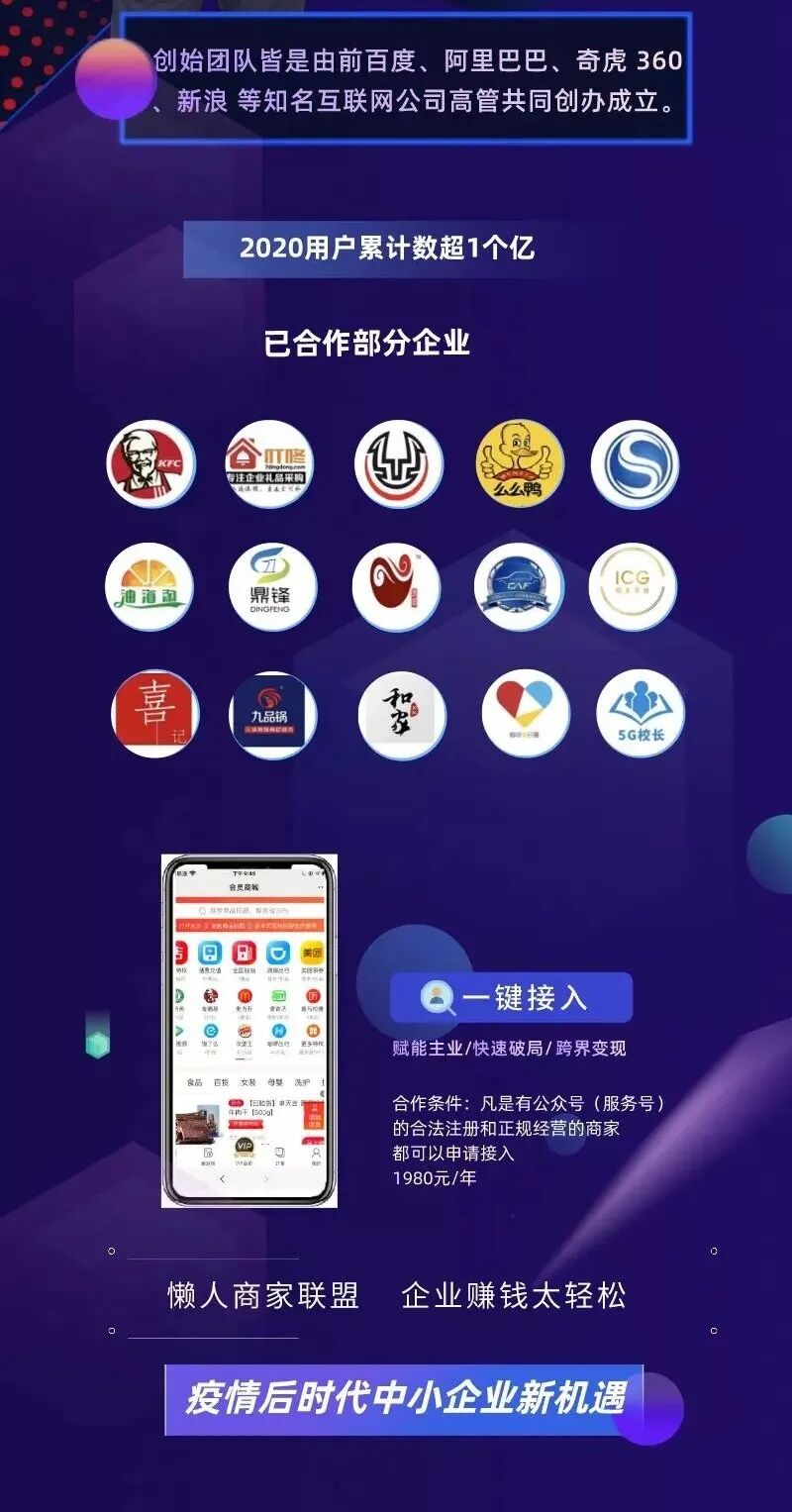 全球领先的一站式商家赋能平台,汇聚了全网海量优惠信息,累计用户数近一个亿!为商家共享600多个互联网聚头优质低价资源供应链;帮助签完企业构建私域流量会员体系;