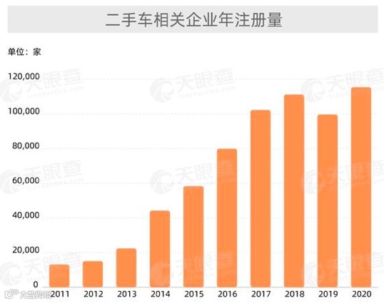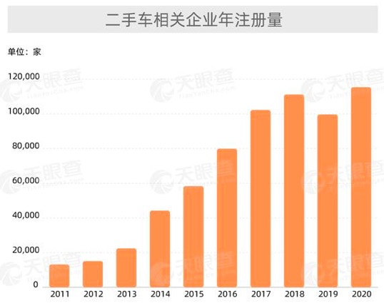 天眼查专业版数据显示,近年来我国二手车相关企业年注册量迅猛增长,如今二手车相关企业年注册量较10年前翻了三番(全部企业状态)。以工商登记为准,2020年我国新增11.5万家二手车相关企业,同比2019年上涨16%。