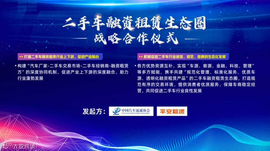 凝聚行业力量,共建行业融合发展新格局,除达成二手车融资租赁生态圈战略合作外,平安租赁还先后联合中国汽车流通协会发起《汽车金融行业消费者权益保护倡议公约》、《二手车金融诚信同盟》、《2020年二手车经营企业营商环境调研报告》。未来,平安租赁将持续深耕二手车融资租赁生态圈,与更多行业参与方紧密合作、互惠共赢,共同驱动二手行业蓬勃发展!