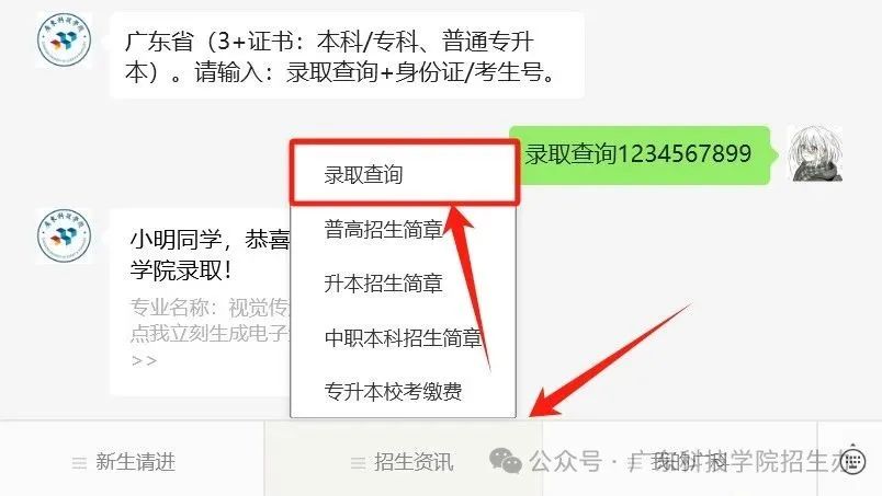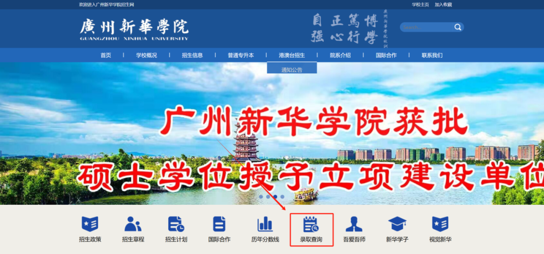 关注“广州南方学院”微信公众号,点击底部菜单栏“招生专栏”-“录取查询”即可进入查询页面;