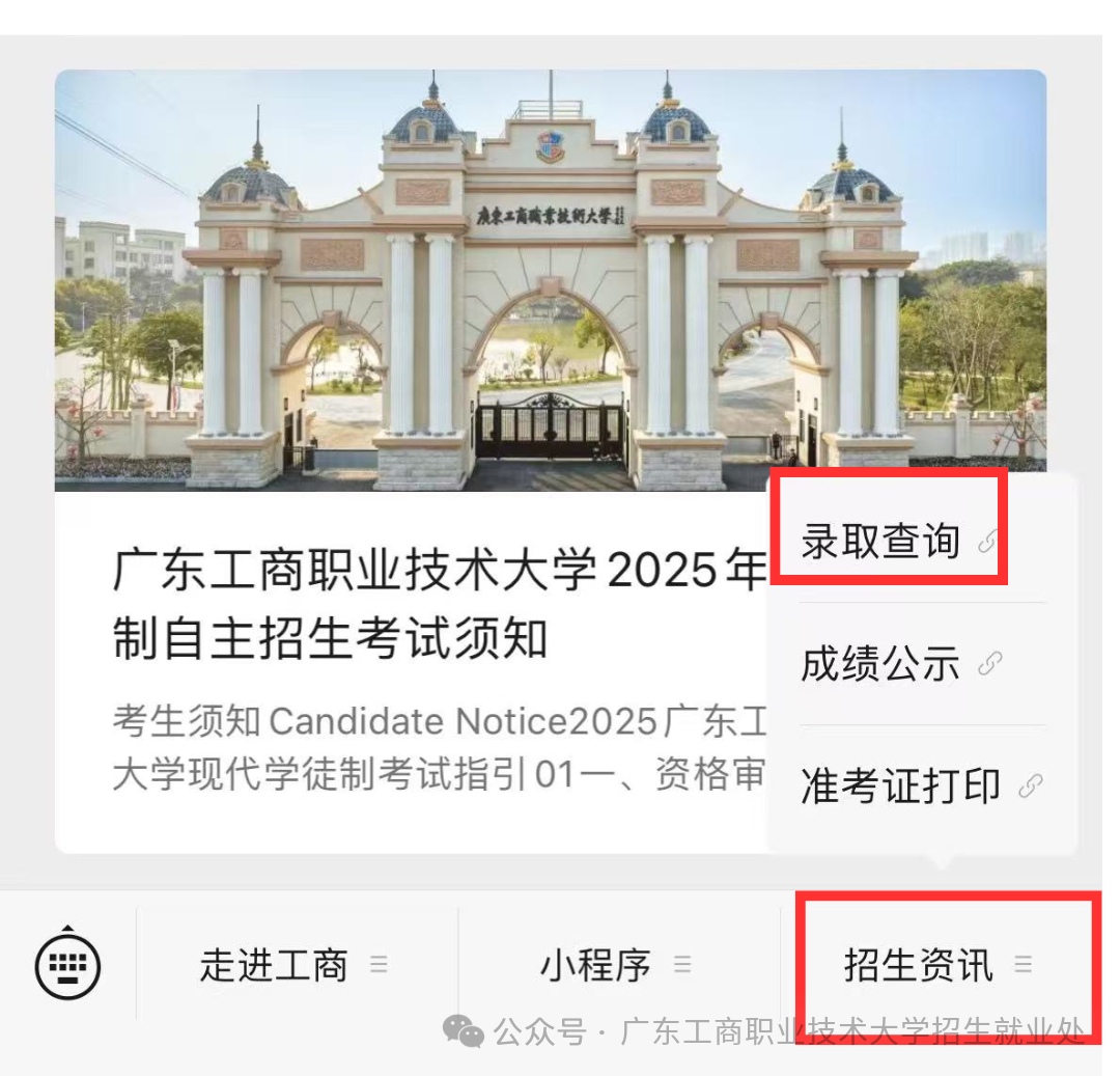 关注我校招生办微信公众号“广东工商职业技术大学招生就业处”,进入公众号页面,点击下方菜单栏的“招生资讯”,选择录取咨询,进入查询页面进行查询即可。