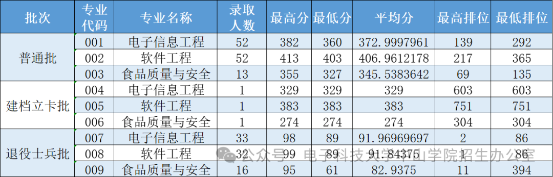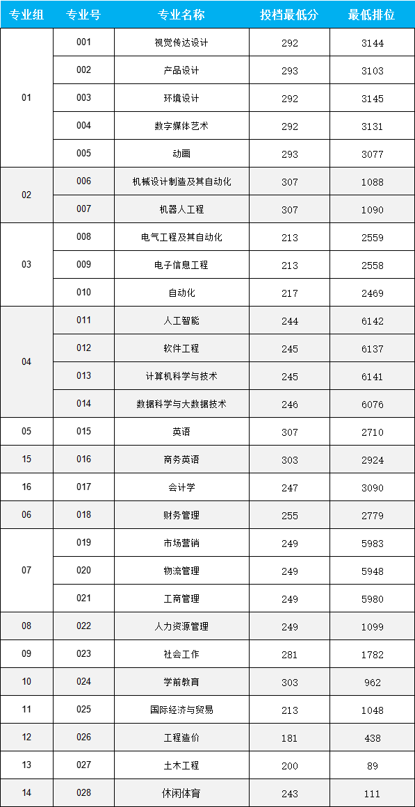 数据科学与大数据技术、电子与计算机工程、网络工程、物联网工程等工科分数线均保持在300分左右,学校在信息技术领域的专业优势凸显。文经管艺类专业也继续保持在300分左右。