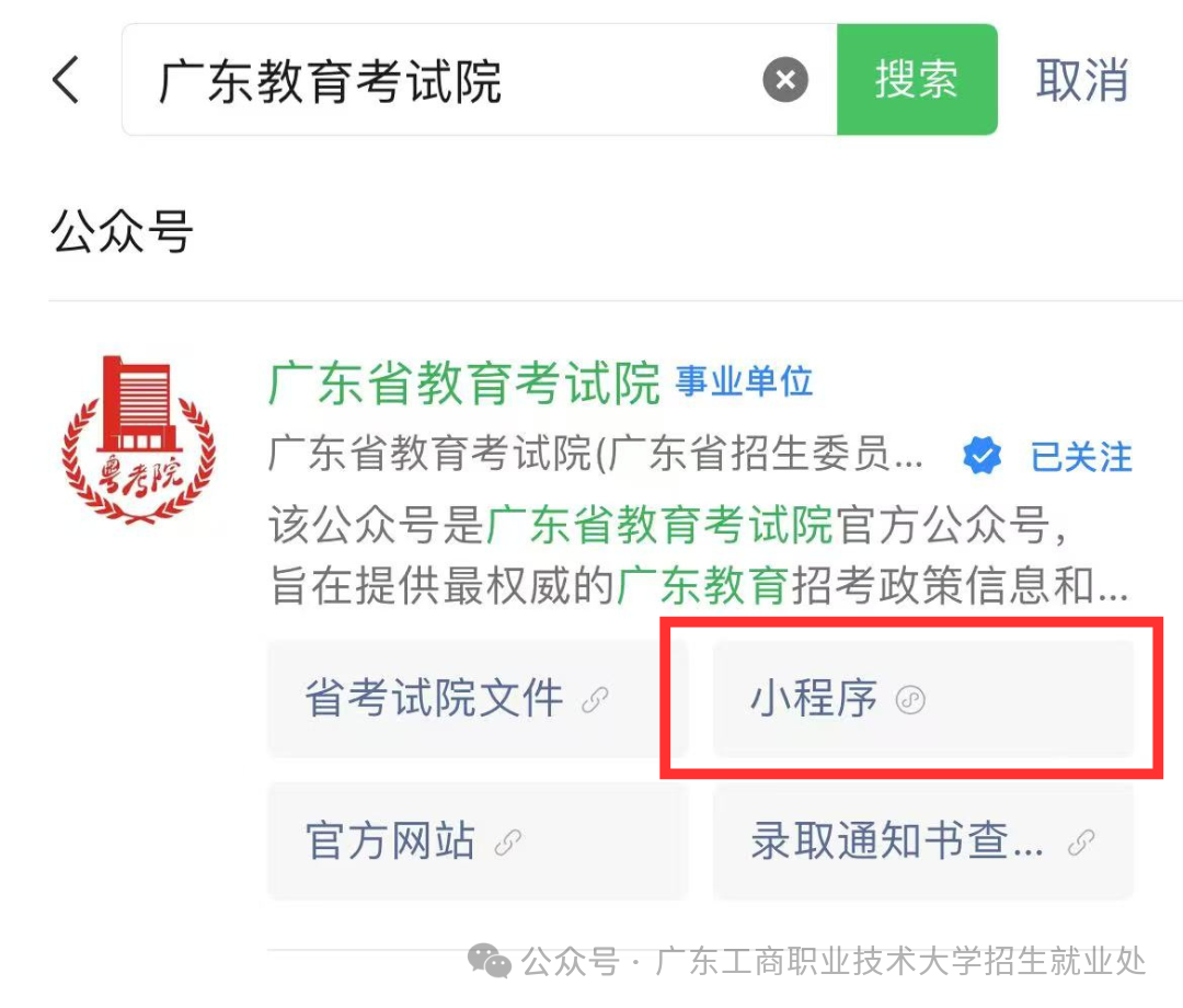 在微信搜索栏中搜索广东省教育考试院微信公众号,点击【小程序】进入