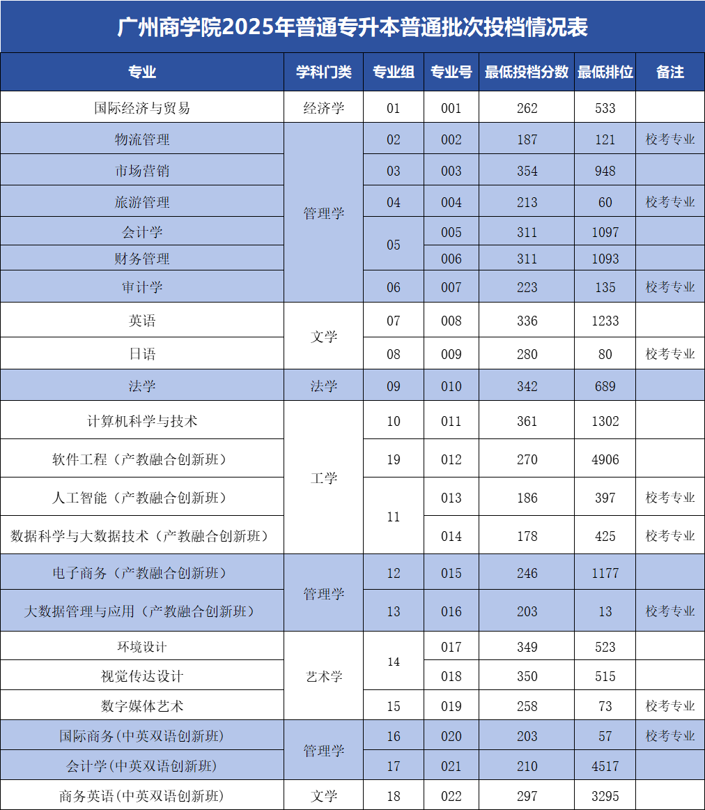 我校2025年普通专升本已录取结束,各类别投档分数线公布如下: