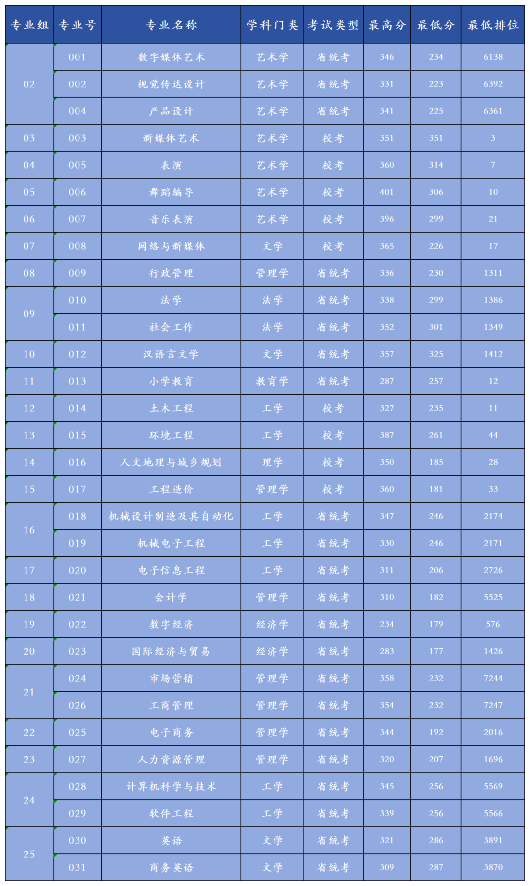 2025年新增专业:软件工程最低分350、最高分401;网络空间安全最低分294、最高分385。