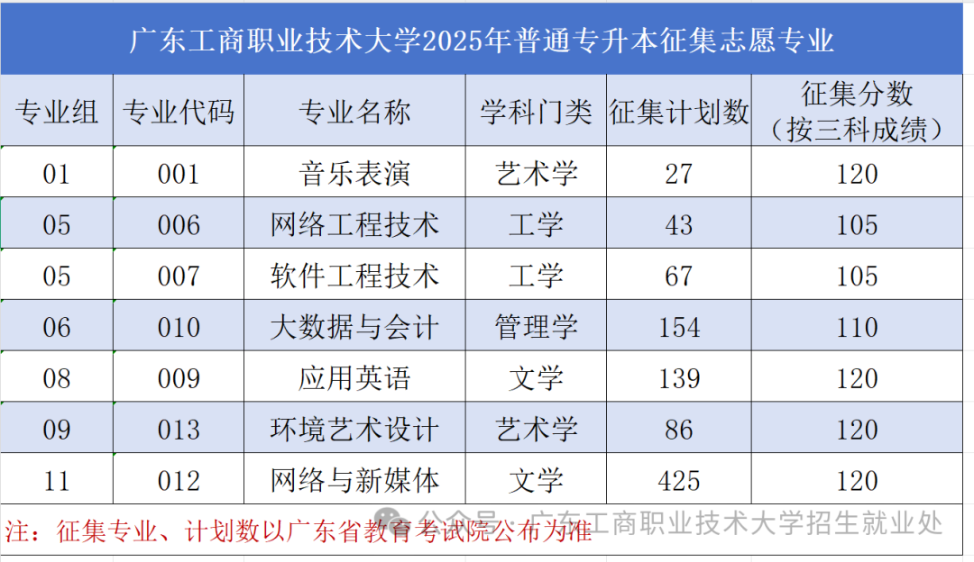 温馨提示:广东工商职业技术大学2025年普通专升本普通批、退役士兵批的最终录取分数线、排位及录取结果均以广东省教育考试院官方公布为准。建档立卡考生的录取信息请密切关注广东省教育考试院发布的相关公告。