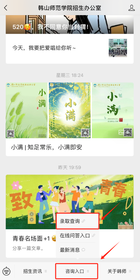 点击“韩山师范学院招生办公室”公众号下方菜单栏“录取查询”,即可跳转至韩山师范学院录取情况查询系统。