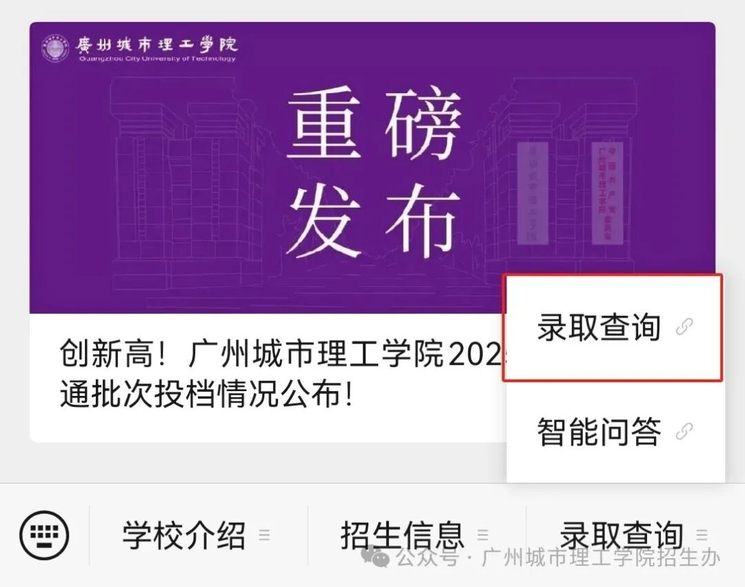 关注“广州南方学院招生办公室”公众号,点击底部菜单栏“招生咨询”-“录取查询”即可进入查询页面。