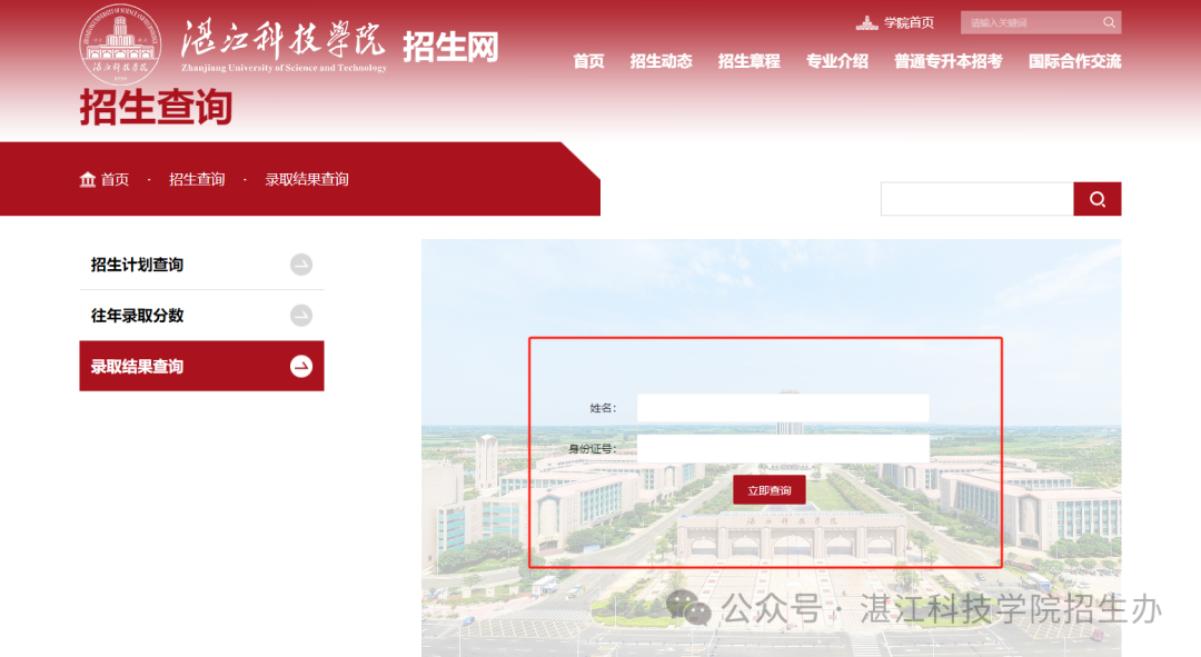 关注“湛江科技学院招生办”微信公众号,点击菜单栏中招生信息-录取查询栏目,输入信息查询录取结果。