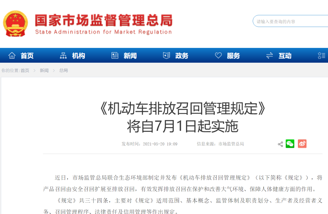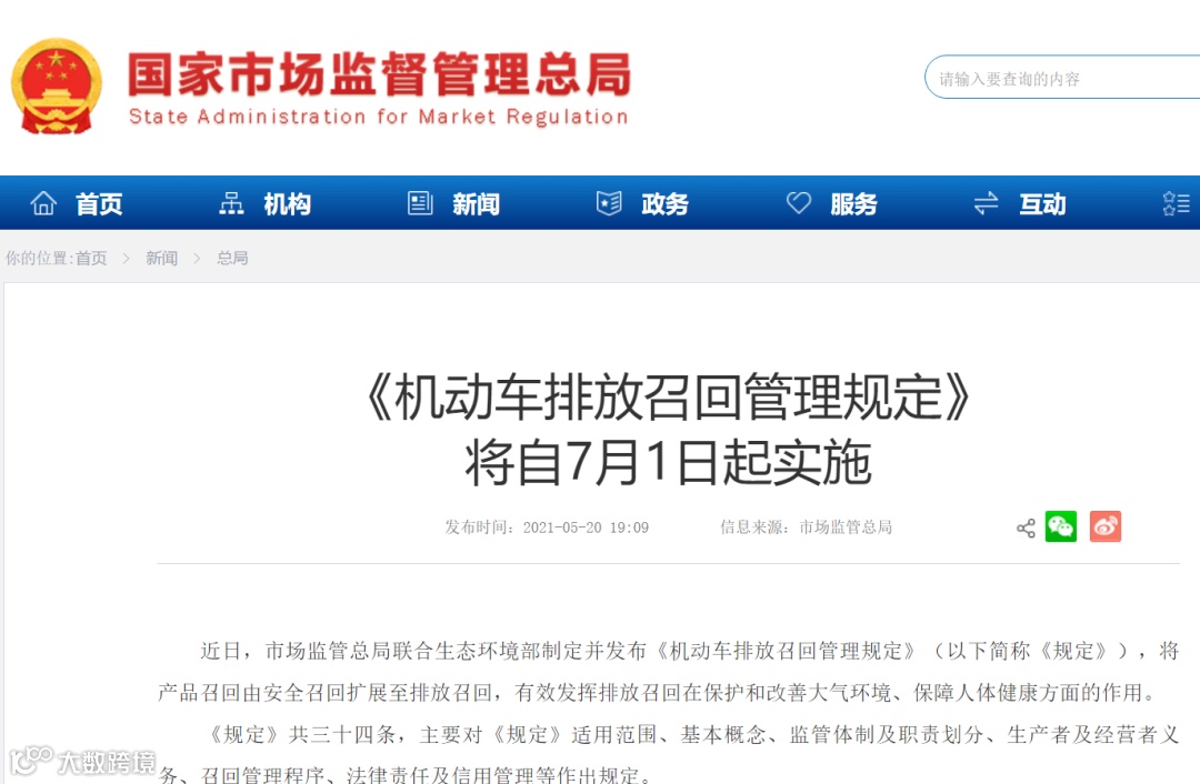 近日,市场监管总局联合生态环境部制定并发布《机动车排放召回管理规定》(以下简称《规定》),将产品召回由安全召回扩展至排放召回,有效发挥排放召回在保护和改善大气环境、保障人体健康方面的作用。