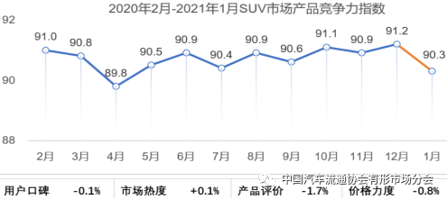 以2019年1月为基期,2021年1月整体市场产品竞争力指数为90.5,环比上月下滑0.6个点;从三大细分市场来看,轿车环比下滑0.5个点,SUV环比下滑0.9个点,MPV环比提升0.3个点。