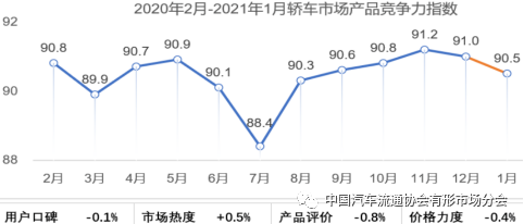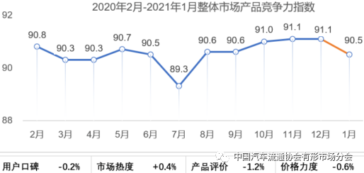 2月25日,中国汽车流通协会汽车市场研究分会(乘用车市场信息联席会,乘联会)联合上海福蓝汽车技术有限公司(CAM汽车咨询)发布2021年1月乘用车市场“产品竞争力指数”为90.5。指数由用户口碑、市场热度、产品评价、价格力度四个维度指标量化而成。