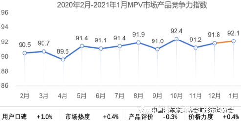 1月MPV市场产品竞争力指数为92.1,环比提升0.3个点,其中产品评价下滑0.3个点,其余指标均提升。