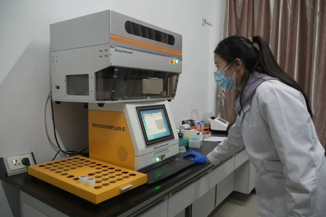 数米高的全自动扦样机“机械手”在运粮车内随机“抓取”不同位置的稻谷,并将样品封装后通过管道输送至质检室。质检室内,工作人员将刚提取的稻谷样品脱壳研磨,放入白色圆形塑料盒内,随后再放入食品重金属快速检测仪。