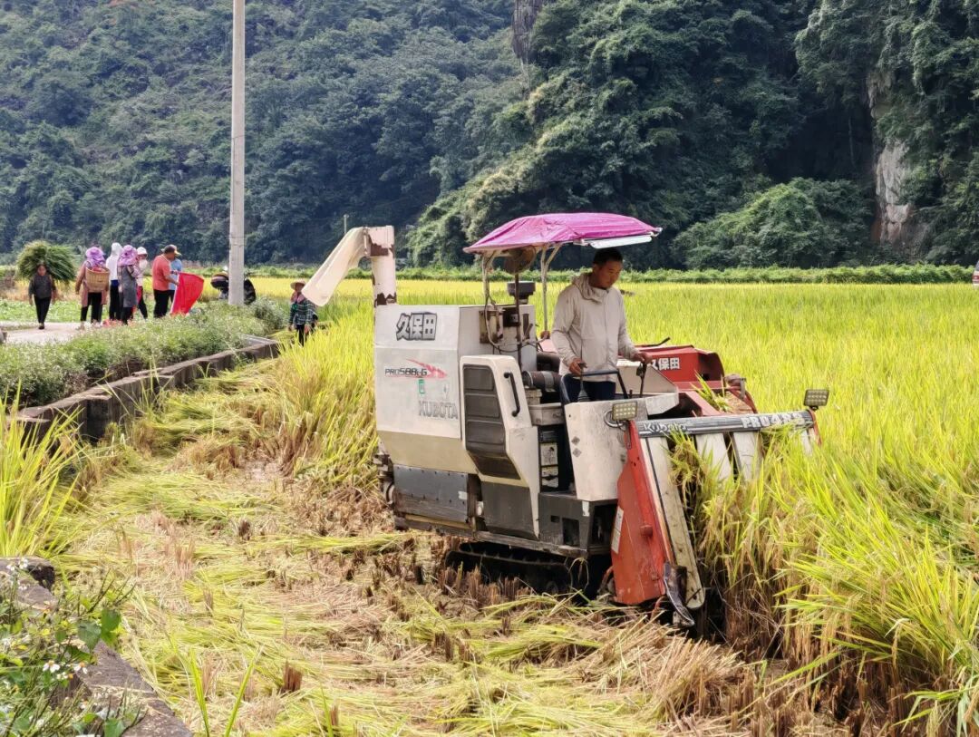 金秋时节的凌云县,广袤田野稻浪翻金,收割机轰鸣作响,农民脸上洋溢着丰收的喜悦,处处是一派繁忙的丰收景象。