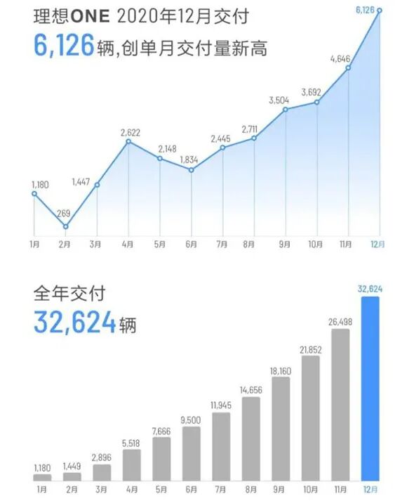 理想汽车在2020年共交付32624辆理想ONE,其中12月交付6126辆。相比上个月的4646辆,环比增长31.9%。