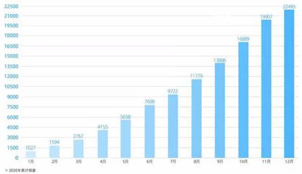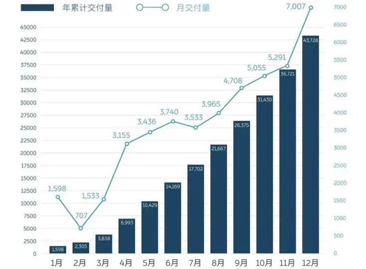 蔚来2020年全年累计交付了43728辆车,其中12月份的销量创单月交付量历史新高,达到7007辆。