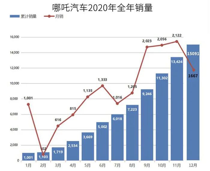 零跑汽车2020全年销量为11391台,12月份销量为3024辆,环比增长49%。其中12月份中T03就贡献了2981的成绩。可以说零跑在经历了一段黑暗时期,最终凭借T03打了个翻身仗。