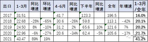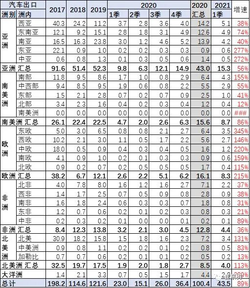 近日,中国汽车流通协会最新发布的汽车出口数据显示,今年一季度,中国汽车出口43万辆,同比增长89%,环比去年四季度增长19%,中国汽车出口市场持续走强。当然,去年的低基数也是今年数据增长的原因之一:2020年我国汽车出口量下降13%。