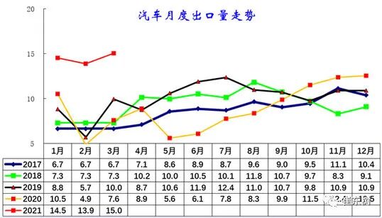 从月度走势看,近几年汽车出口市场呈现夏季走高见顶回落特征,但2020年相反,改为V型走势。在疫情下,2020年的7-12月出口相对国内走势较强,形成国外较国内慢一步回暖的特征,最终全年实现整车出口(含底盘)106万辆。
