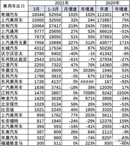 另外,今年一季度中国乘用车企业出口表现较强,尤其是奇瑞、上汽乘用车、吉利、通用、长安、五菱等企业,出口量名列前茅,其中上汽通用五菱一季度增速高达312%。