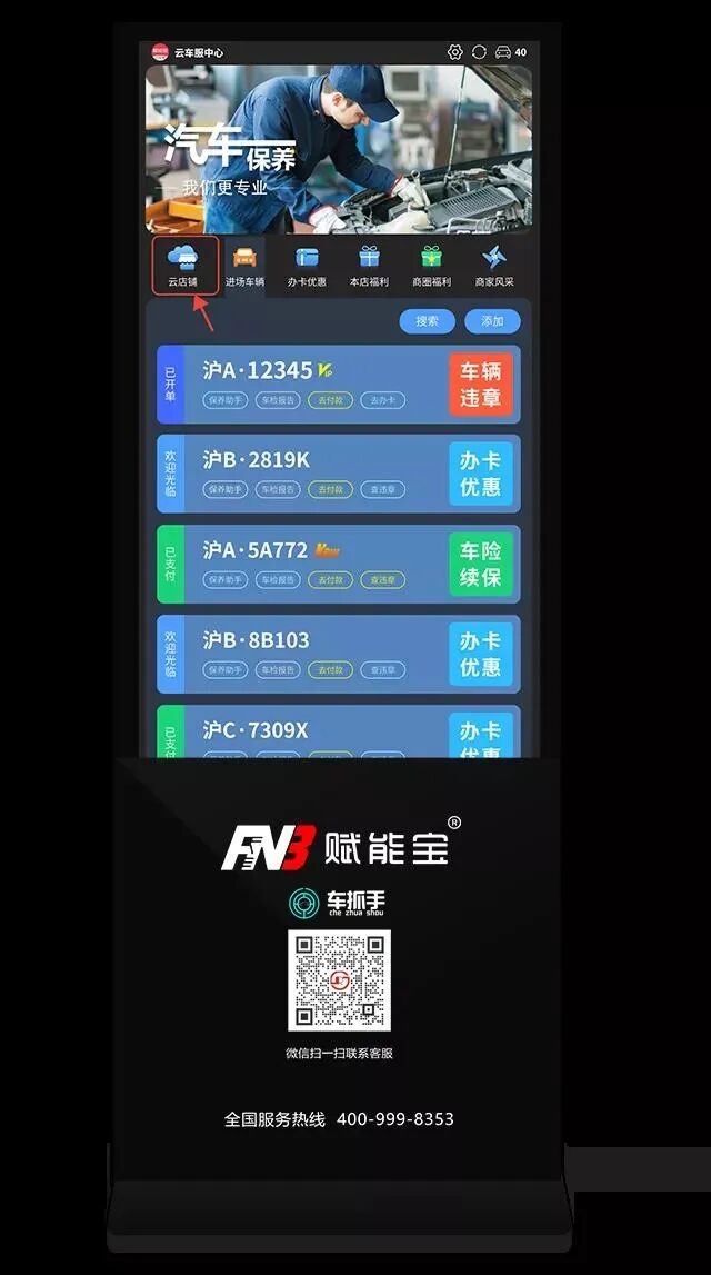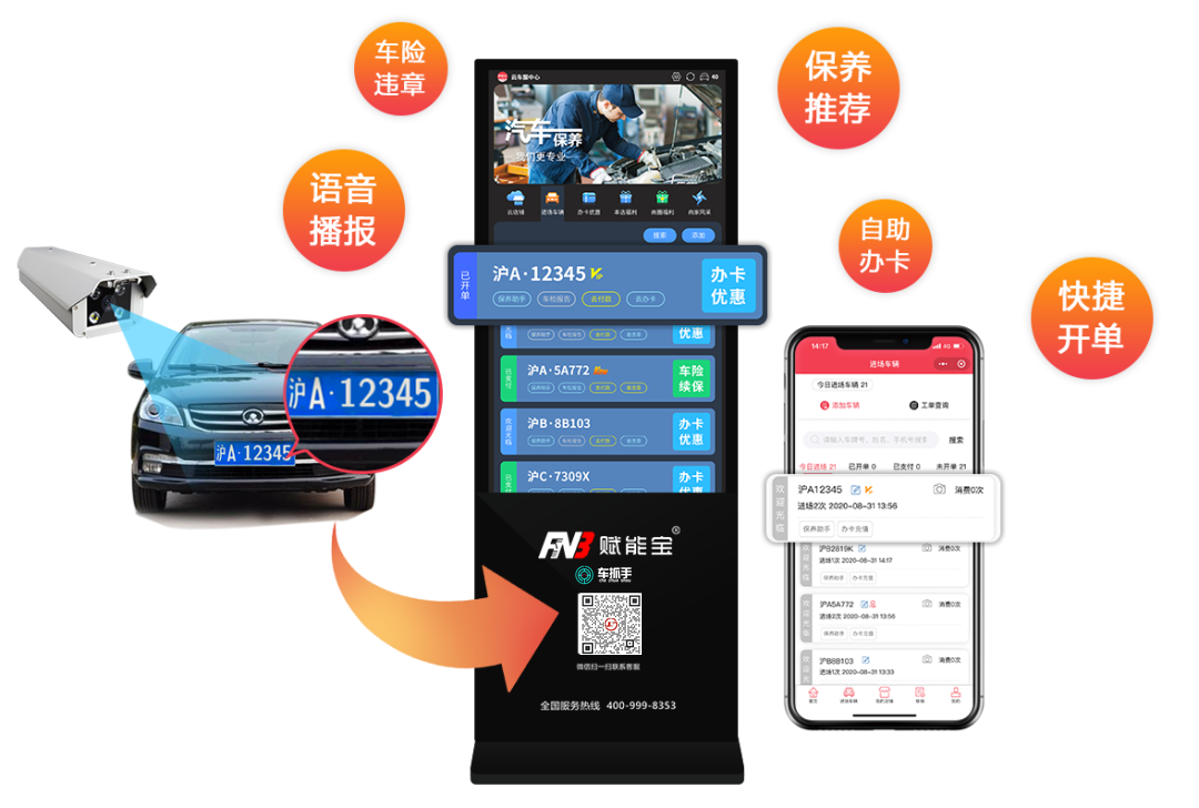车抓手赋能宝智能IoT硬件设备,由智能AI车牌摄像机和触控一体机(大屏)组成。实时识别到店车辆并主动语音提醒,同时智能推送业务商机,可视化展示本店服务项目/会员卡/商家风采/本店营销福利/本地商圈福利,为车主客户提供自助交互服务入口,支持线上便捷开单/支付等“一站式智能化”服务体验。