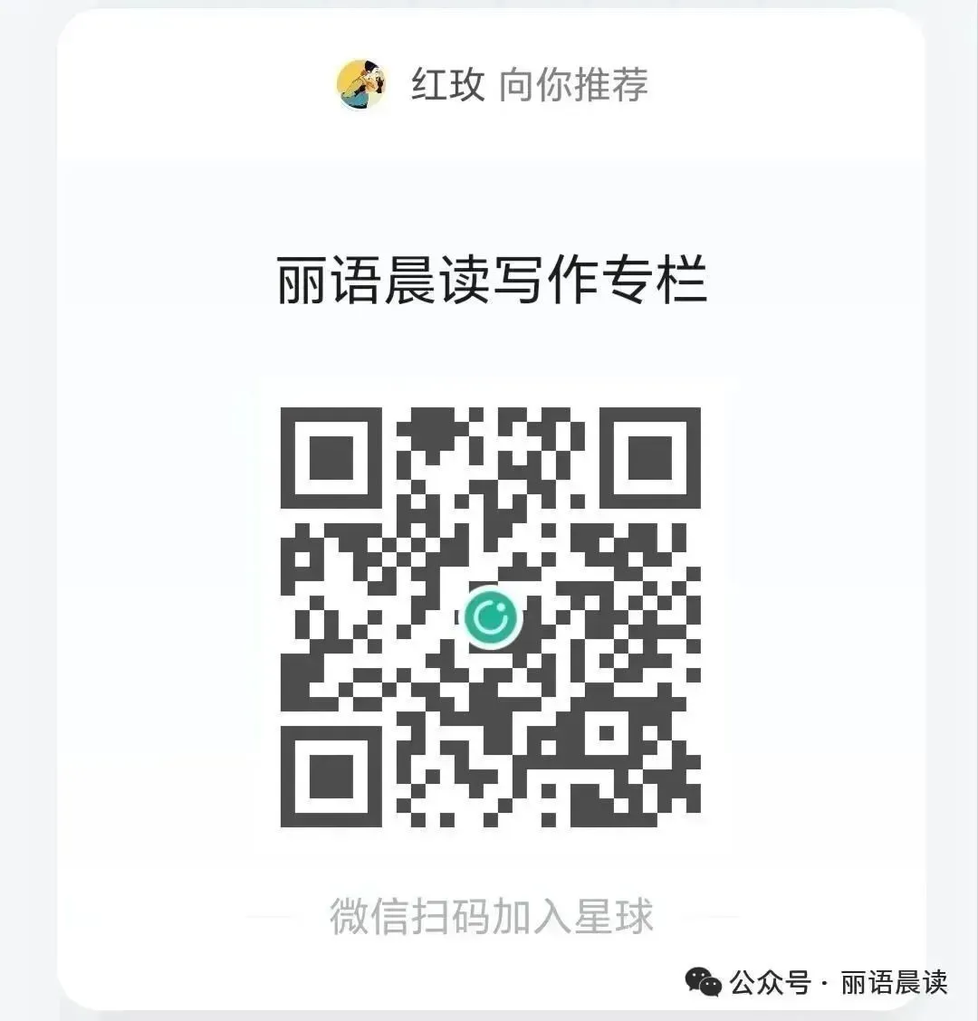 小语开通了一个知识星球,写作专栏,丽语晨读写作星球包括五个主题:高考作文模板、跟着满分作文学写作、时鲜写作素材(包含高考满分作文)、模拟试题优秀作文、高考写作技巧。每天更新,有问题可以留言,会有老师回复。欢迎来小语的知识星球一起学习!