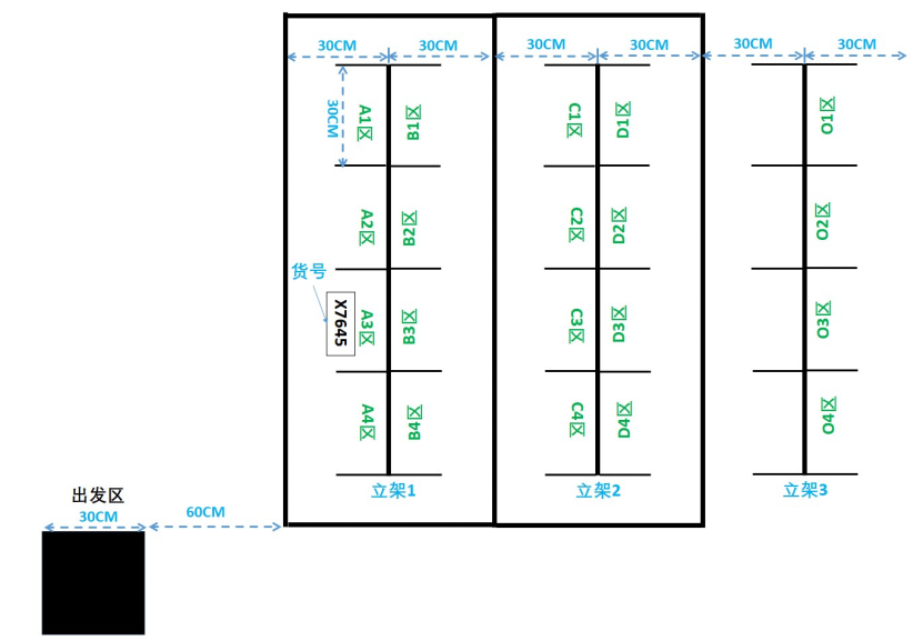 (2)将盘点机器人放置于出发区,通过按键启动机器,实现机器人对立架3储物区盘点。到达指定位置时发出声/光报警。