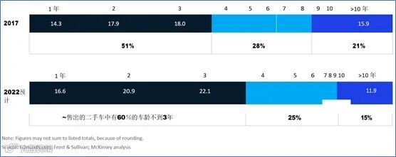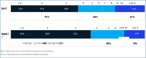 其次,就美国的二手车市场来说,美国二手车库存越来越年轻,价格也越来越高,整个市场已经看到了向新车型的强劲转变。麦肯锡的分析预测,在2017年至2022年之间,二手车的状况将变得越来越年轻,七年及七年以上车龄的汽车将出现大幅下降,三年以下的二手车数量将从2017年的51%增长到2022年的约60%。这种车龄变化的关键可能是由于租赁车辆的供应增加, 其中许多属于较新的认证二手(CPO)(下图所示)。