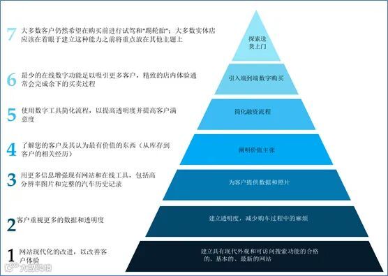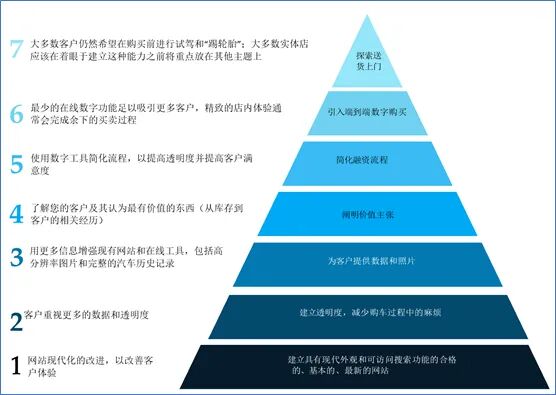 在询问客户在购买二手车时他们最关心的是什么时,麦肯锡的调研结果发现,普通人群中出现了清晰的关注点的不同等级(下图所示)。所以,尽管数字技术已成为人们关注的焦点,但客户也希望在二手车购买的过程中提升基本环节的服务。例如,他们希望零售商能做到一下7点: