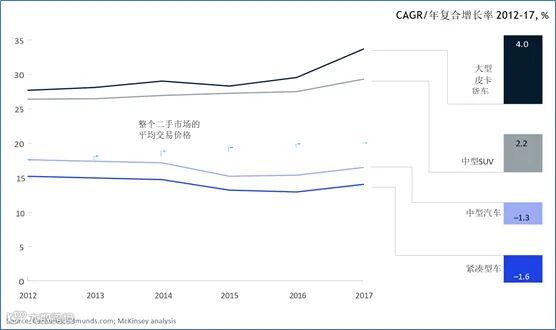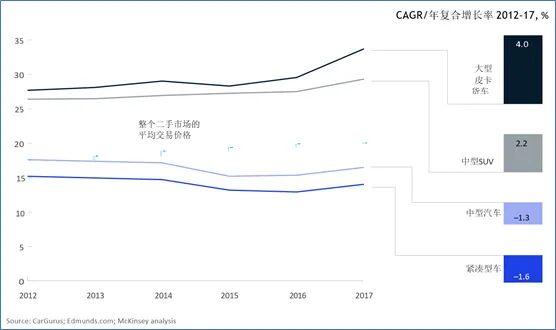 同时,由于SUV和皮卡的组合更加丰富,二手车价格正在上涨(下图所示)。例如,越来越多的美国客户在使用了三年的车辆中选择了全尺寸皮卡车和中型或大型SUV,从而导致价格在2012年至2017年之间分别上涨了4.0%和2.2%。二手三年的中型和紧凑型汽车的价格分别下降了1.3%和1.6%,二手车市场的整体平均交易价格上涨了2.7%。这种转变很可能是汽车行业普遍从新车市场转向轻型卡车和SUV的早期反映。