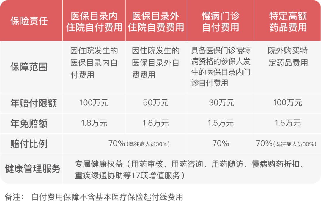 被保险人在保险期间内在医保定点医疗机构发生的住院自付费用、住院自费费用、慢病门诊自付费用、特定高额药品费用,保险人按保险方案约定赔付,并为被保险人提供健康管理服务。
