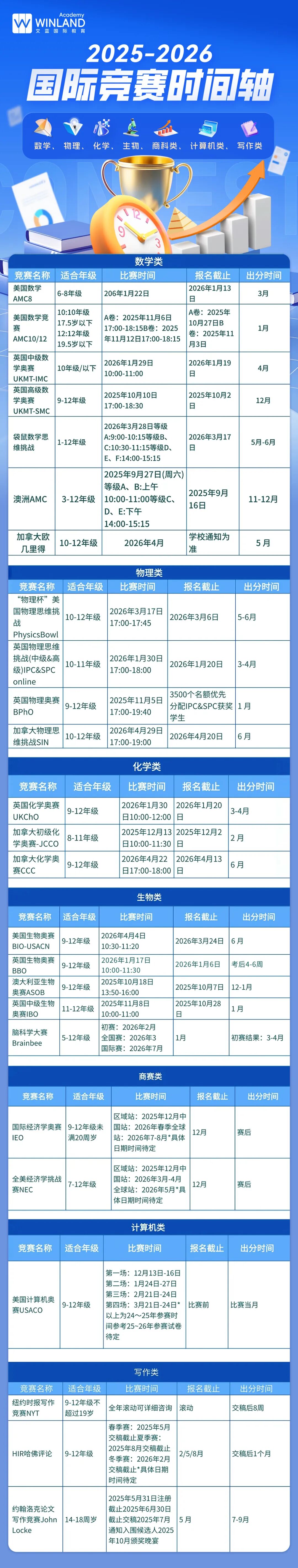 避免贪多求全,选择2-3个高含金量竞赛重点突破。规划时应考虑竞赛时间安排,避免与学校考试和申请准备时间冲突。