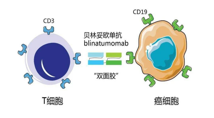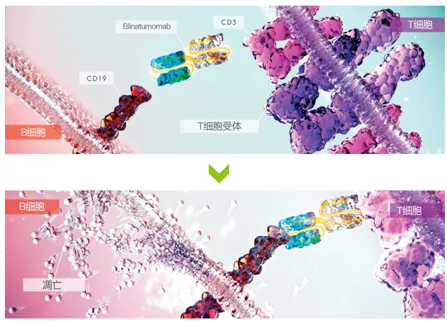 下面这个图比较真实的模拟了工作的情况,B细胞表面有CD19可以和贝林妥欧单抗一端相连,T细胞上有CD3,和贝林妥欧单抗的另一段相连。