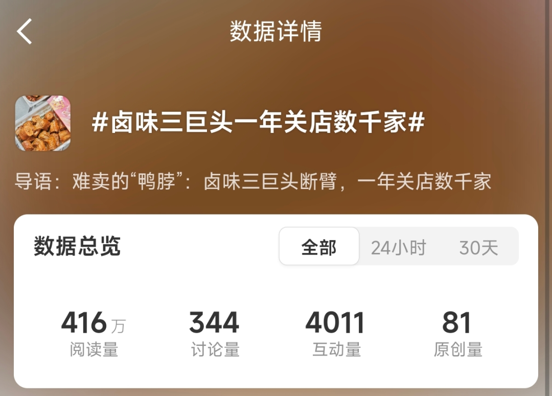 盘点相关搜索发现,最近“卤味三巨头”(绝味、周黑鸭、煌上煌)一年关店数千家的热搜引起了网友的广泛讨论。