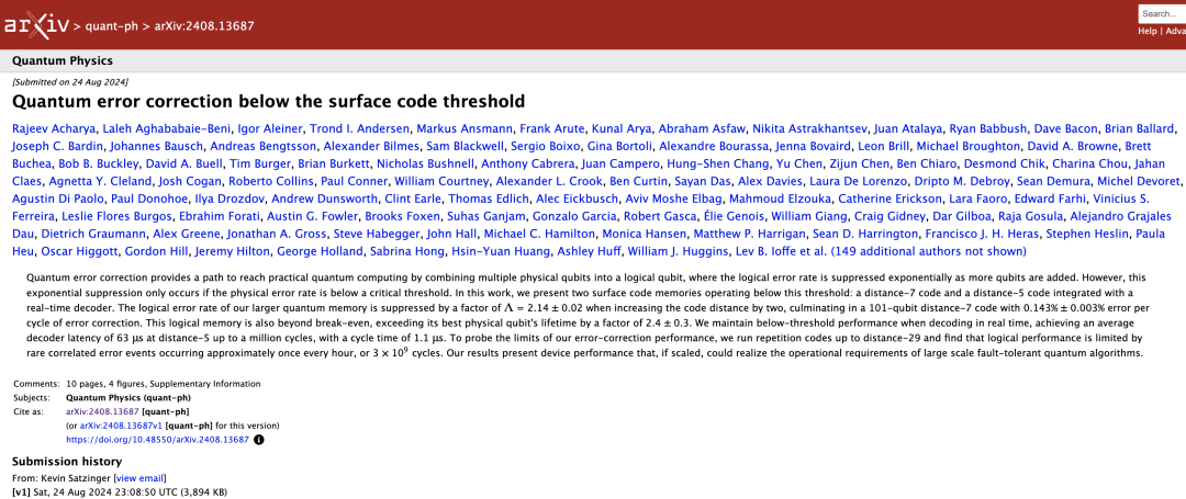 这是自计算机科学家 Peter Shor 1995 年提出“量子纠错”概念以来的一次重大突破。根据谷歌发表的论文,如果未来进一步将量子比特增加,错误率将会指数级下降,降到 10^-10 量级。