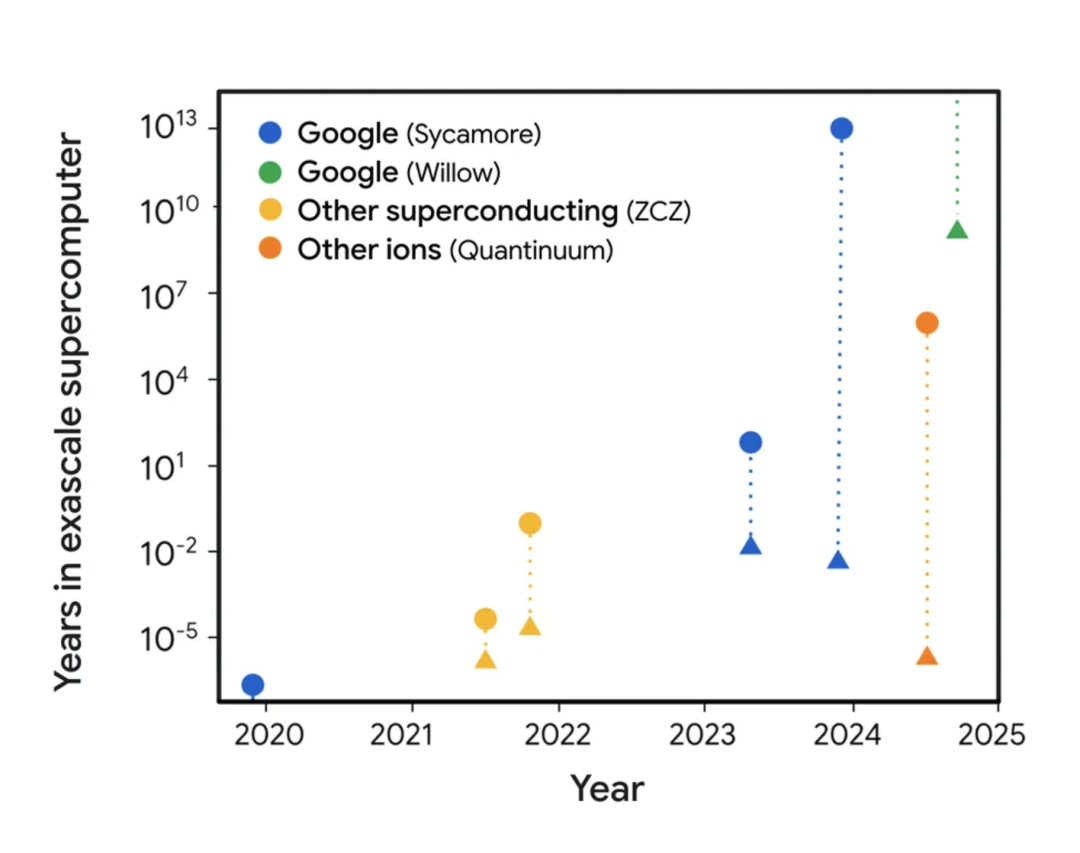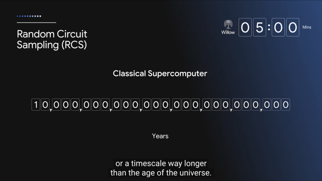 而这一次,Willow 在算力测试中,进一步将理论算力差距拉大到了天文数字的级别。此次 Willow 用 5 分钟完成的计算任务,如果用普通的超级计算机,需要 10^25 年,比宇宙的寿命还长。