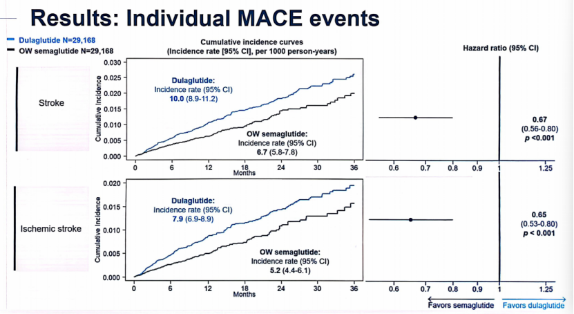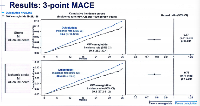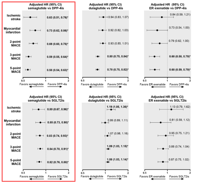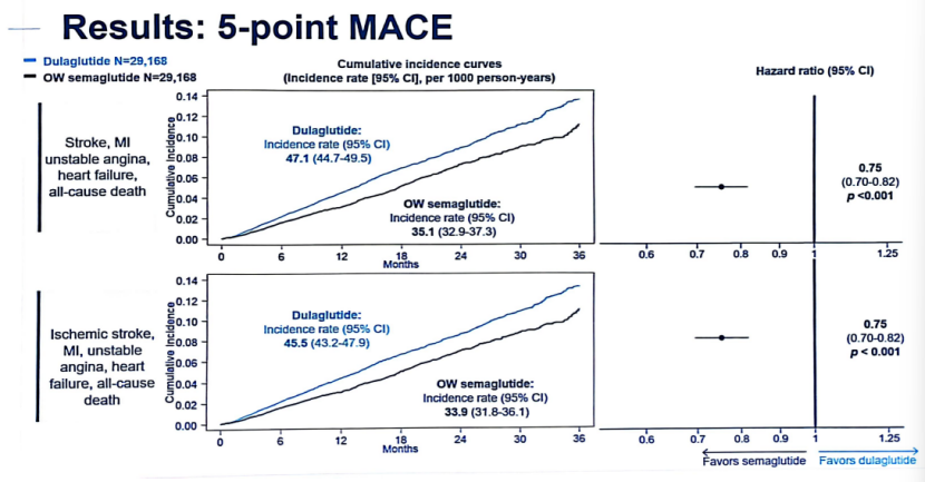 图1 相比度拉糖肽,司美格鲁肽显著降低3P MACE、5P MACE、卒中风险