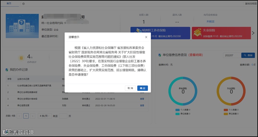 7月25日省集中企保系统开机运行后,名单内企业首次登录系统会弹窗提示“根据《省人力资源和社会保障厅 省发展和改革委员会 省财政厅 国家税务总局湖北省税务局 关于扩大阶段性缓缴社会保险费政策实施范围等问题的通知》(鄂人社发〔2022〕30号)要求,在落实特困行业缓缴企业职工基本养老保险费、失业保险费、工伤保险费(以下称三项社保费)政策的基础上,扩大政策实施范围、延长缓缴期限。请确认是否申请缓缴?”点击“确认”,则会自动跳转至【2022年定向阶段缓缴期确认】。