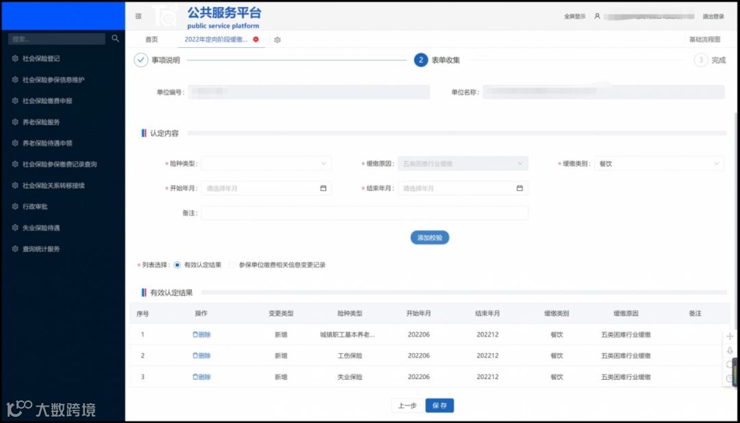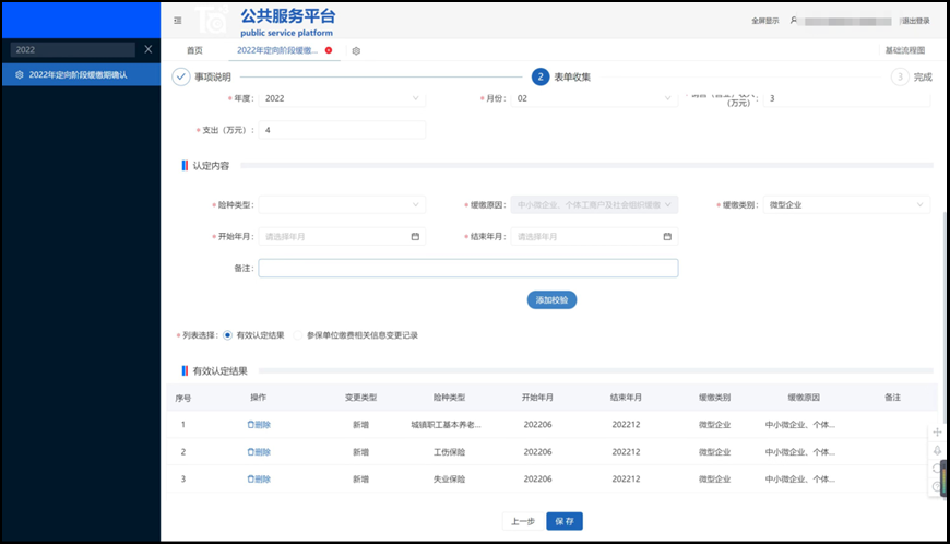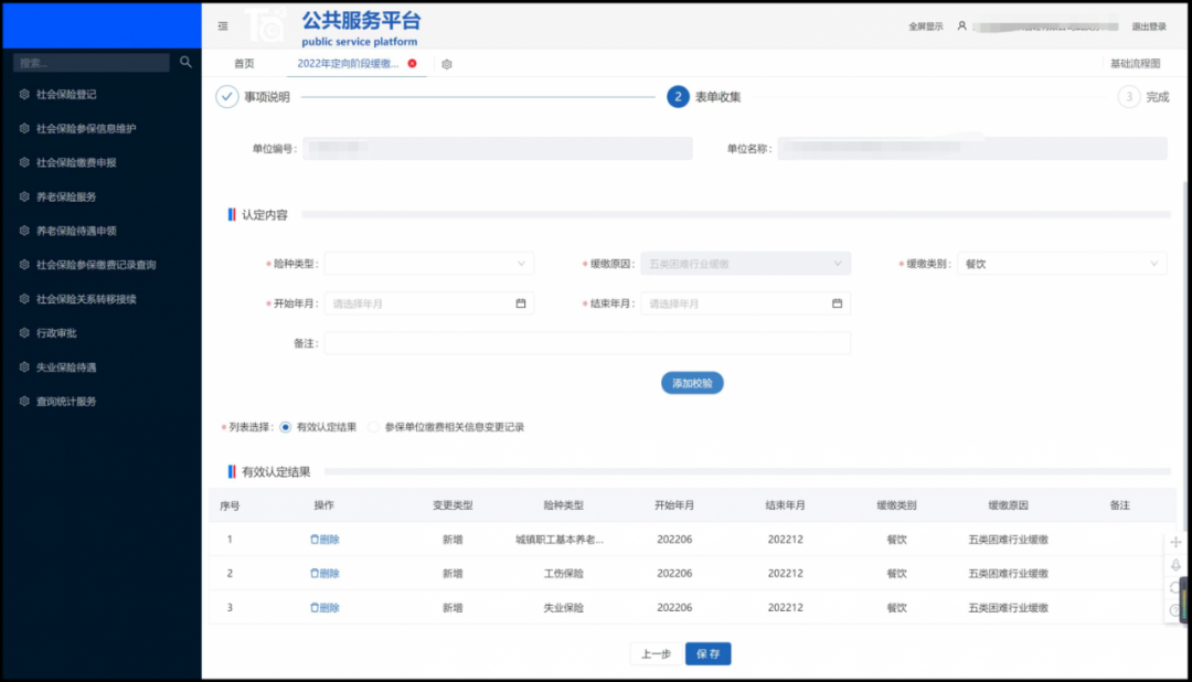 (6)依次选择养老/工伤/失业保险,参照上述步骤录入险种缓缴信息;