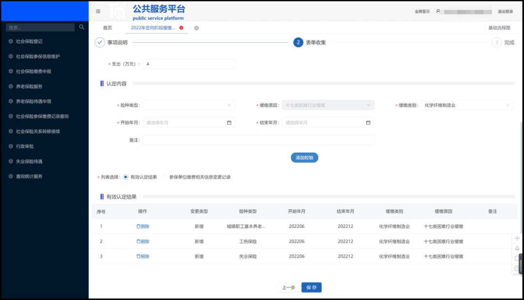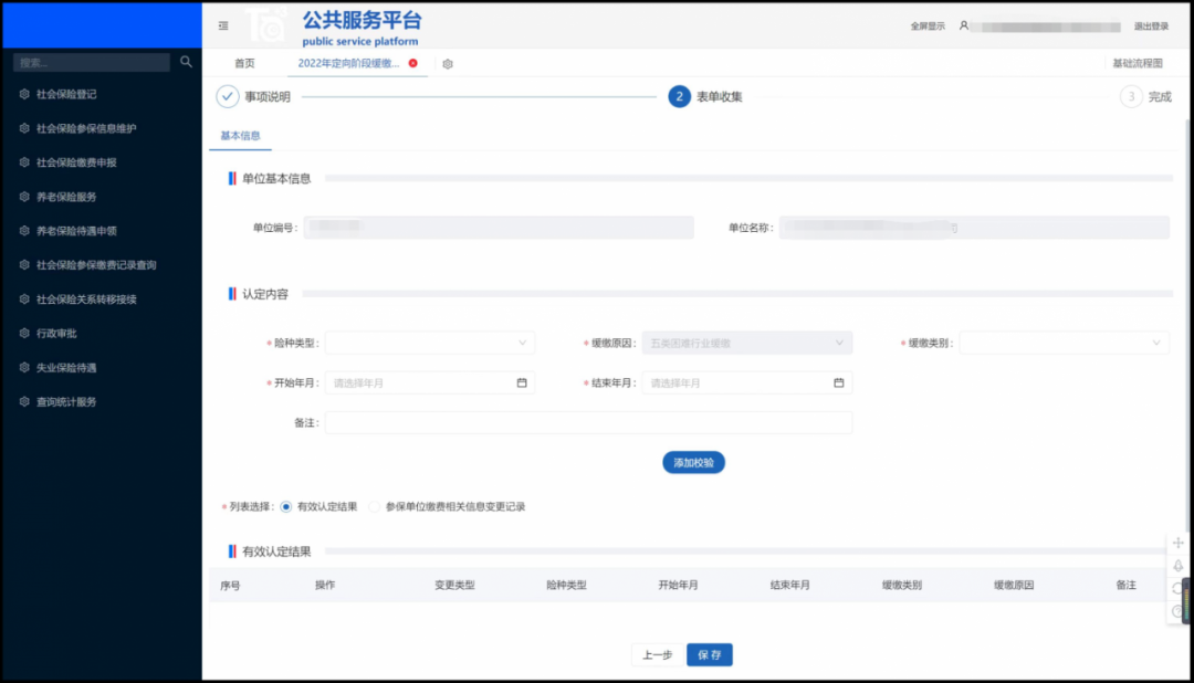 (7)依次选择养老/工伤/失业保险,参照上述步骤录入险种缓缴信息;