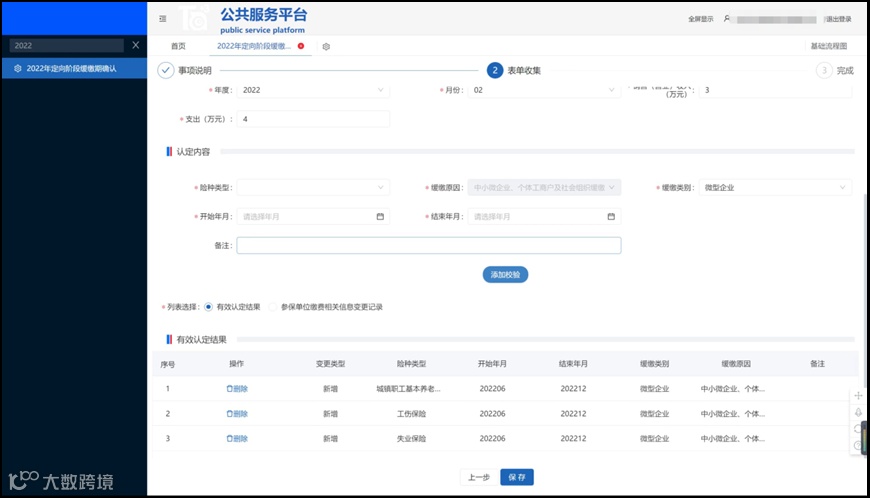 (5)填写缓缴起止时间,养老保险缓缴结束时间不能晚于2022年12月;失业、工伤保险缓缴时间不得超过12个月。