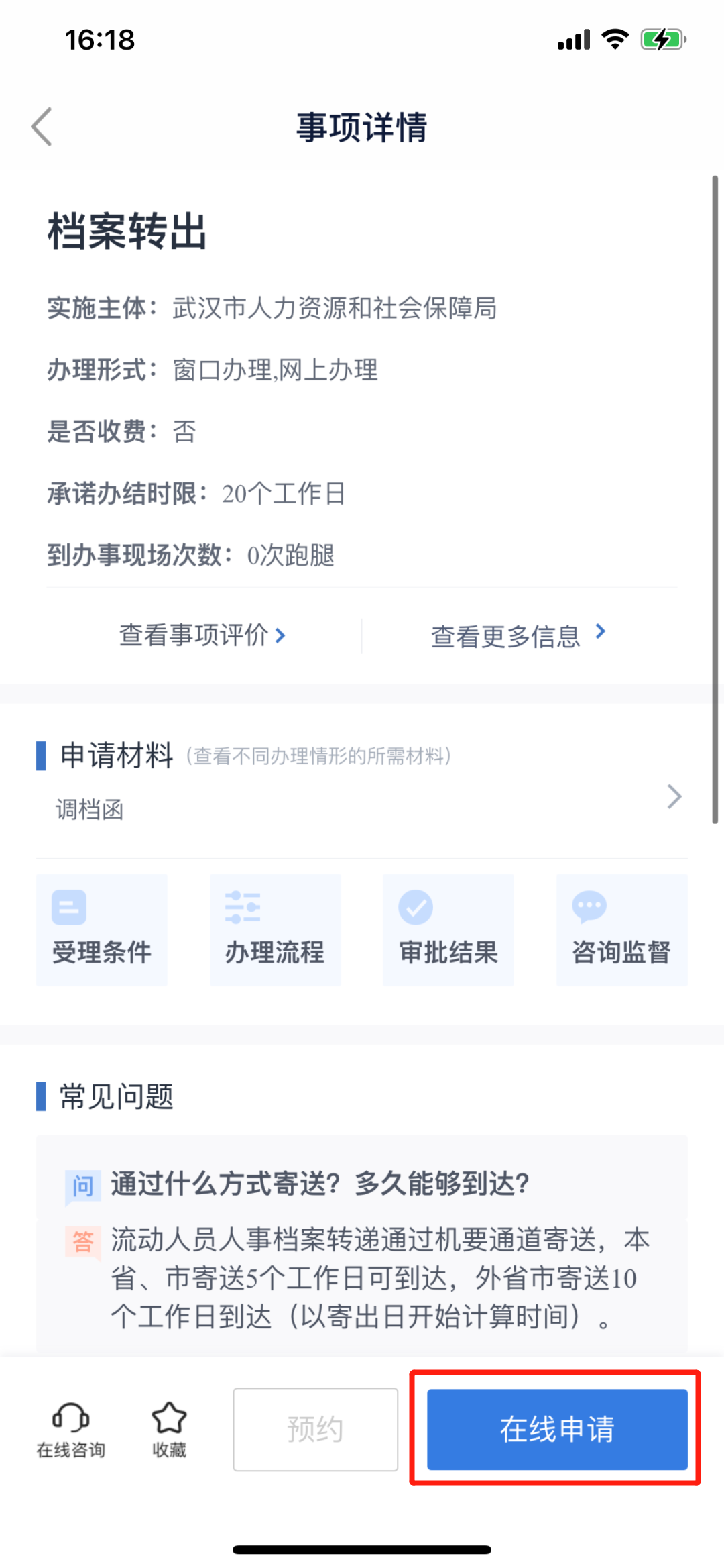 02.根据现在档案托管单位位置“选择地区”,进入“档案转出”页面,了解办理流程后,点击右下角“在线申请”。