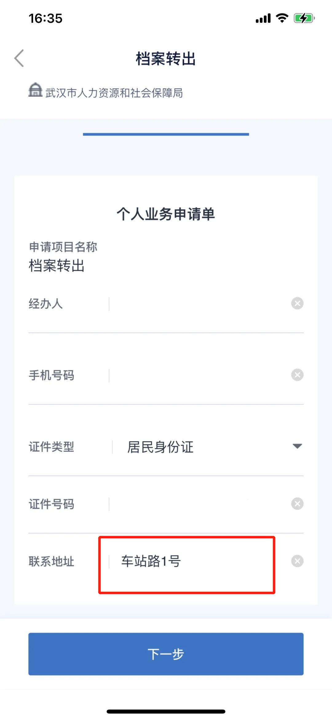 04.在“个人业务申请单”页面,核对个人身份信息,填写“联系地址”。