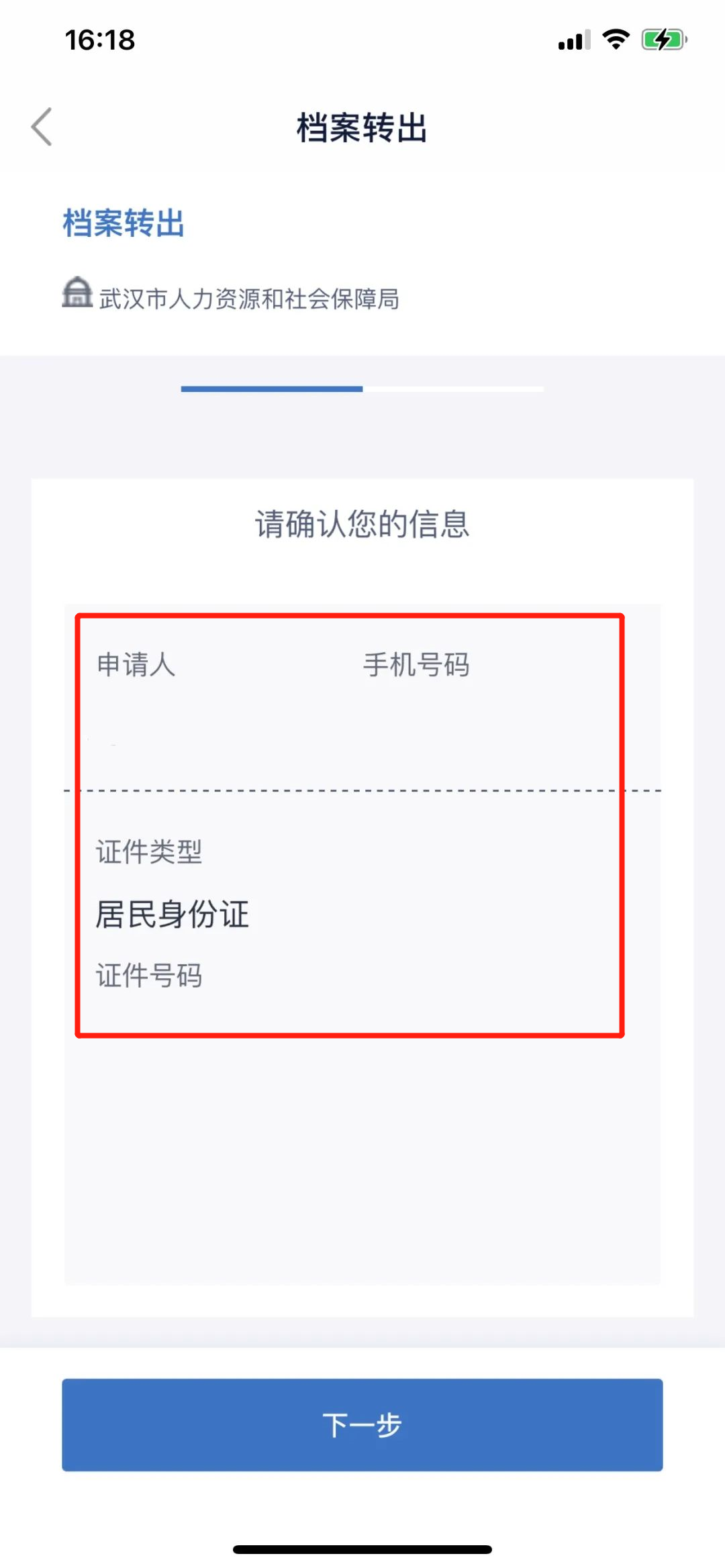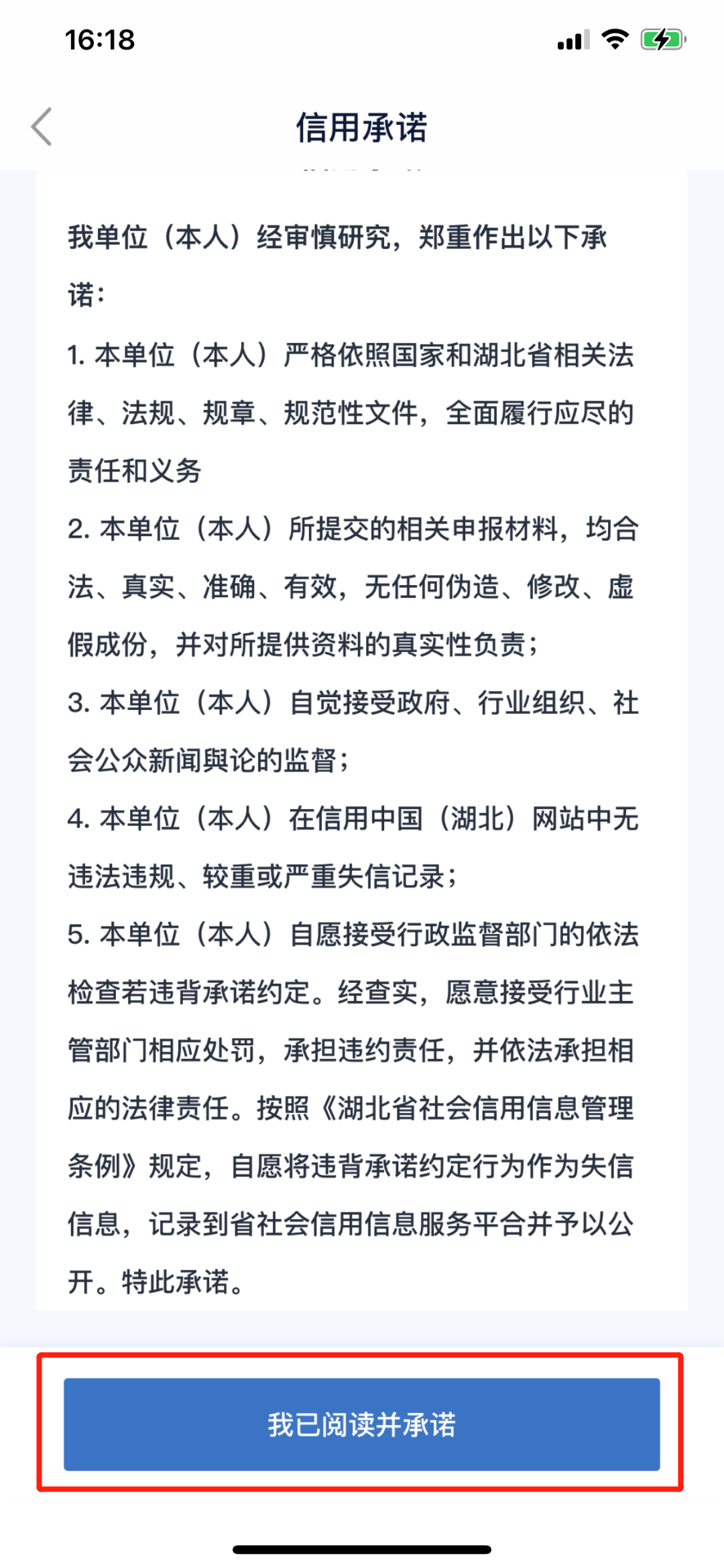03.仔细阅读信用承诺后,点击底部“我已阅读并承诺”,申请人的姓名、手机号及证件号码确认无误后,进行下一步。