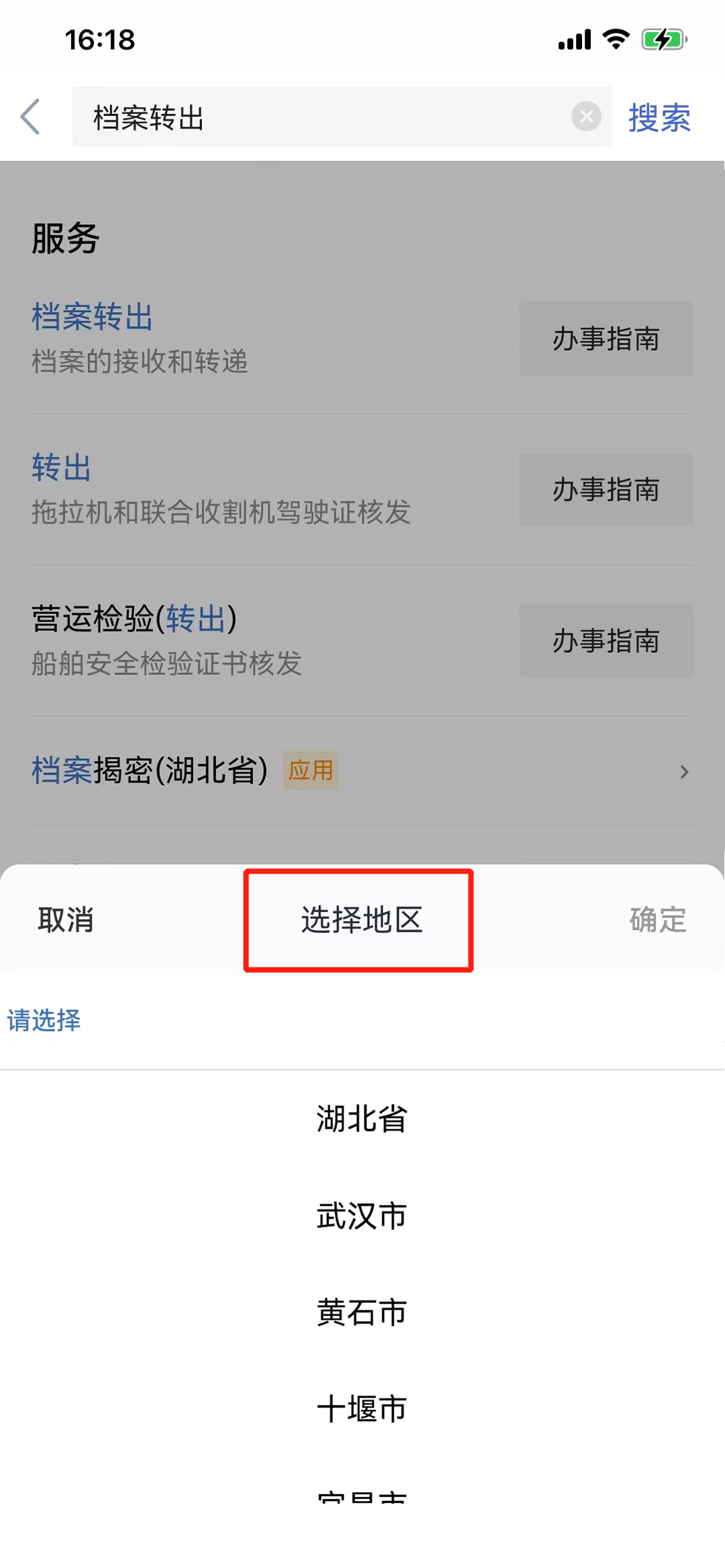 01.打开“鄂汇办”APP,在首页点击搜索栏,搜索“档案转出”,点击右侧“办事指南”。