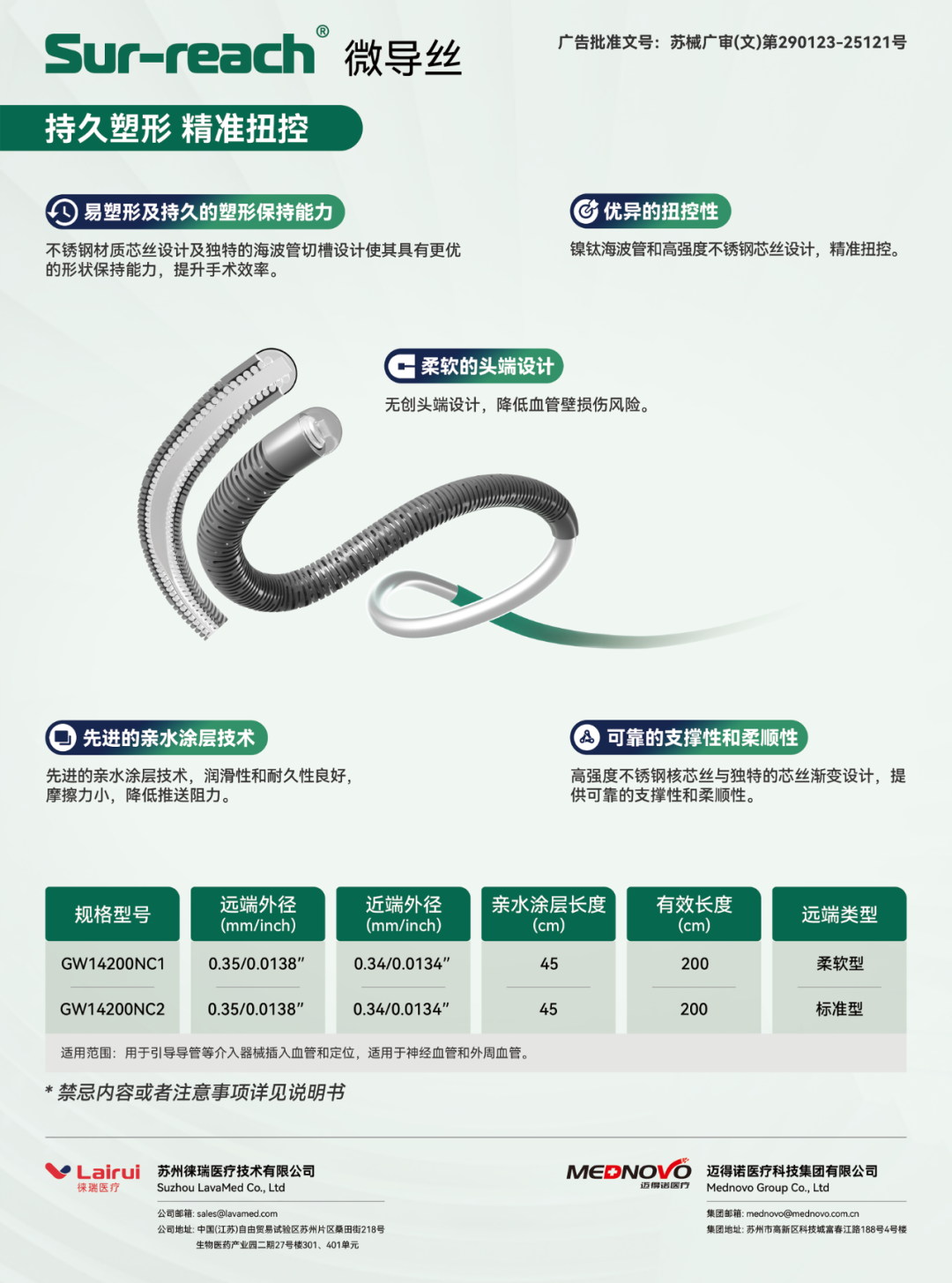 徕瑞医疗成立于2019年8月,是一家聚焦于神经介入领域的高端医疗器械的研发制造企业,2025年,徕瑞医疗成为迈得诺医疗集团全资子公司。徕瑞医疗致力于高品质、创新性的三类高端植介入医疗器械的研发和制造,所有产品具有完全的自主知识产权。在发展模式上,徕瑞医疗构建了独特的“双轮驱动”模式:一方面大力投入制造能力建设,引进世界上最先进的生产线设备,同时自建原材料和基础产业加工基地,通过掌握上游供应链的核心能力,确保产品品质可控,为企业未来的发展方向进行技术储备。另一方面,徕瑞医疗与国内外顶尖医疗机构开展医工合作,致力于通过创新和精益求精的精神打造卓越的产品,为全球神经介入医学的进步创造价值,为脑卒中患者的康复提供最大的福祉。